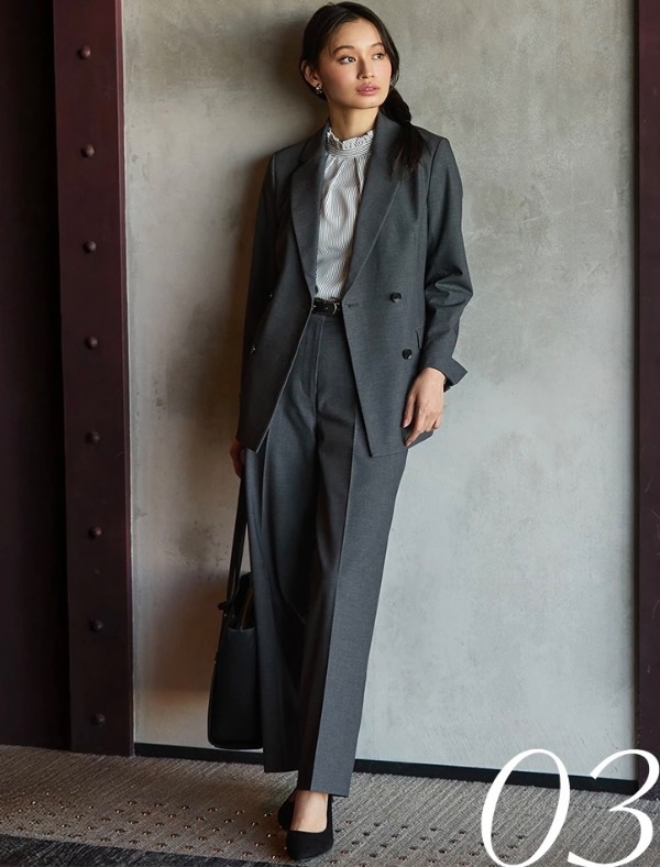 ウール混なので上品な光沢感がある生地できれいにきまります。合わせたのはスタンドフリルカラーのストライプブラウス。マニッシュなコーデにプラスすることで程よい抜け感がでてGOOD。
