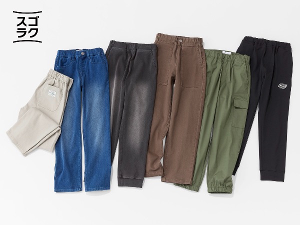 여유로운 카고 타입이나 베이커 팬츠도, 깔끔한 슬림 타입도, 스트레치성이 있어 입기 쉽습니다.