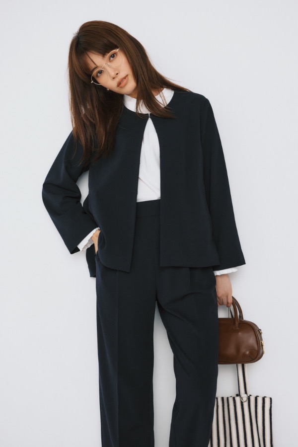 심플한 크루 재킷+프릴 블라우스+스트레이트 팬츠의 3점 세트입니다