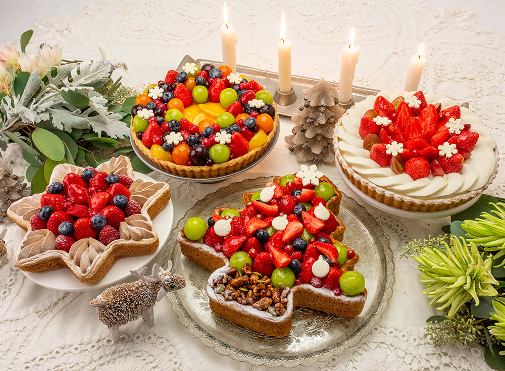 올해의 케이크는 트리, 리스, 별 등의 크리스마스 모티브를 도입한 총 4종류를 준비했습니다. 신작은, 부드러운 브르타뉴산 “르가르” 크림 치즈와 신선한 딸기를 조합한 것, 카카오 향기나는 초콜릿과 새콤달콤한 딸기의 절묘한 콤비네이션의 2종류입니다. 그 외에도 매년 호평을 받고 있는, 여러 가지 과일이 주역인 트리와 리스형 타르트도 등장합니다.