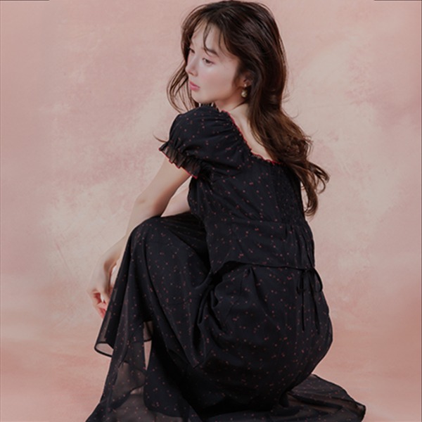 오리지널 체리 무늬를 얹은 경쾌한 쉬폰이 단맛과 품위를 적절히 강조하는 원피스.