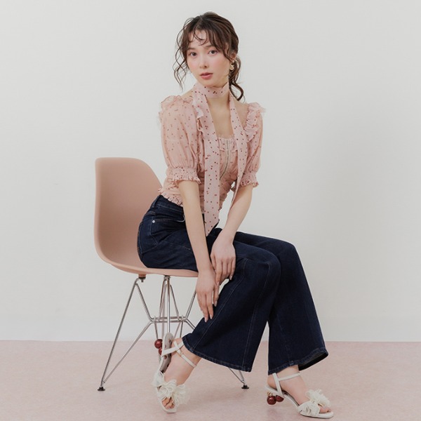 오리지널 체리 무늬에 튤을 겹쳐, 달콤함과 경쾌함을 돋보이게 한 화려한 블라우스.