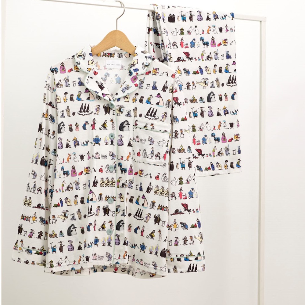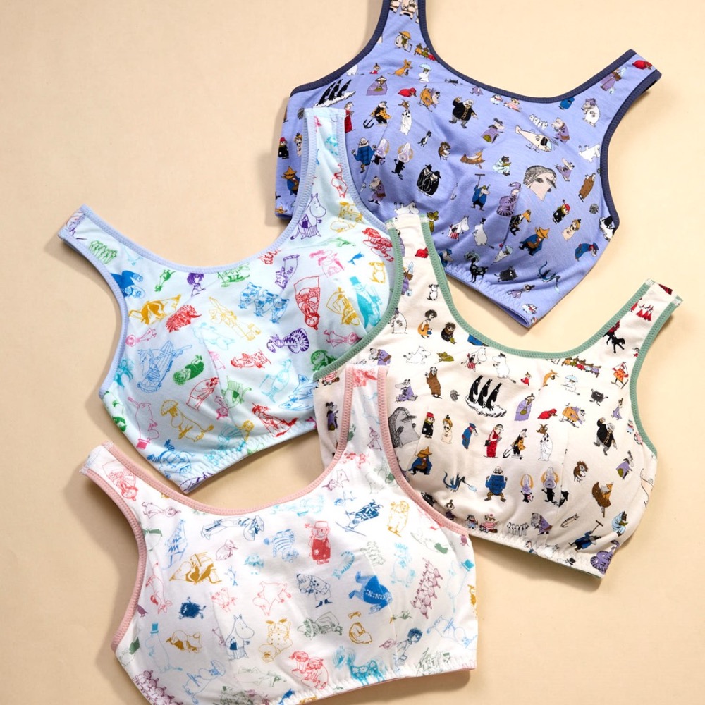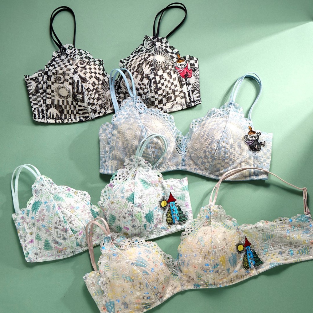 안쪽의 BL/GR는 무민 계곡의 주민이 즐거워 보이는 기하학적 패턴의 프린트 레이스와 활기 가득한 리틀 미이의 아플리케 장식이 조화를 이루어, 컬렉션하고 싶어지는 디자인입니다.