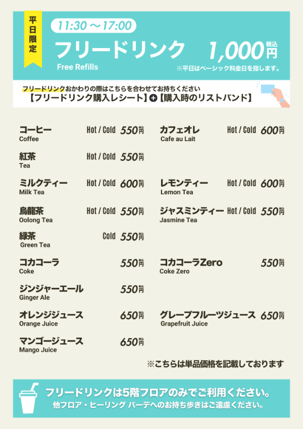 ※店頭にて販売しているフリードリンク単体は営業カレンダーA・B日程がご利用可能です。