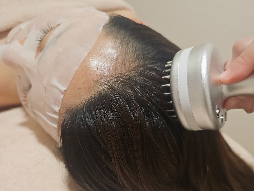 EMS 기기를 사용한 두피와 얼굴 마사지로 탄력 있는 인상을 줍니다.