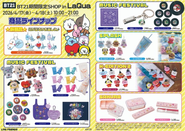4월 17일(금)·18일(토)의 2일간 한정으로, 도쿄 돔 시티 라쿠아(종합상업시설)에서 「BT21」의 상품 판매를 실시합니다.